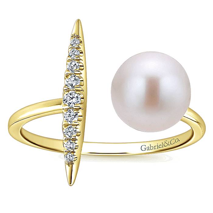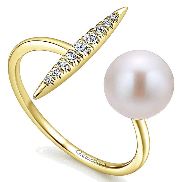 Open Silhouette Ring Capped By Tapered Column of Diamonds And Lustrous Cultured Pearl in 14k Yellow Gold