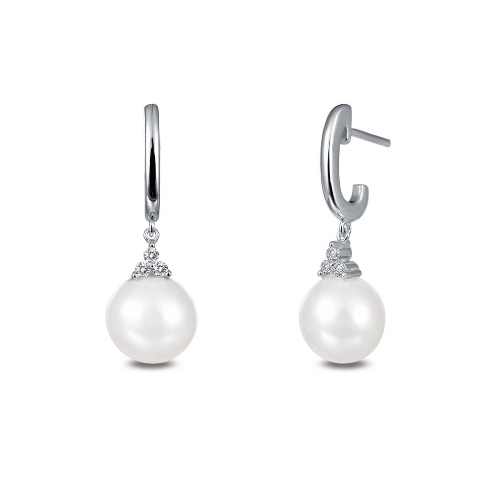 Organic gemstones feature brilliant luster and shine with traditional grace and beauty These elegant fresh water pearl dangle earrings are set with simulated diamonds in sterling silver bonded with platinum