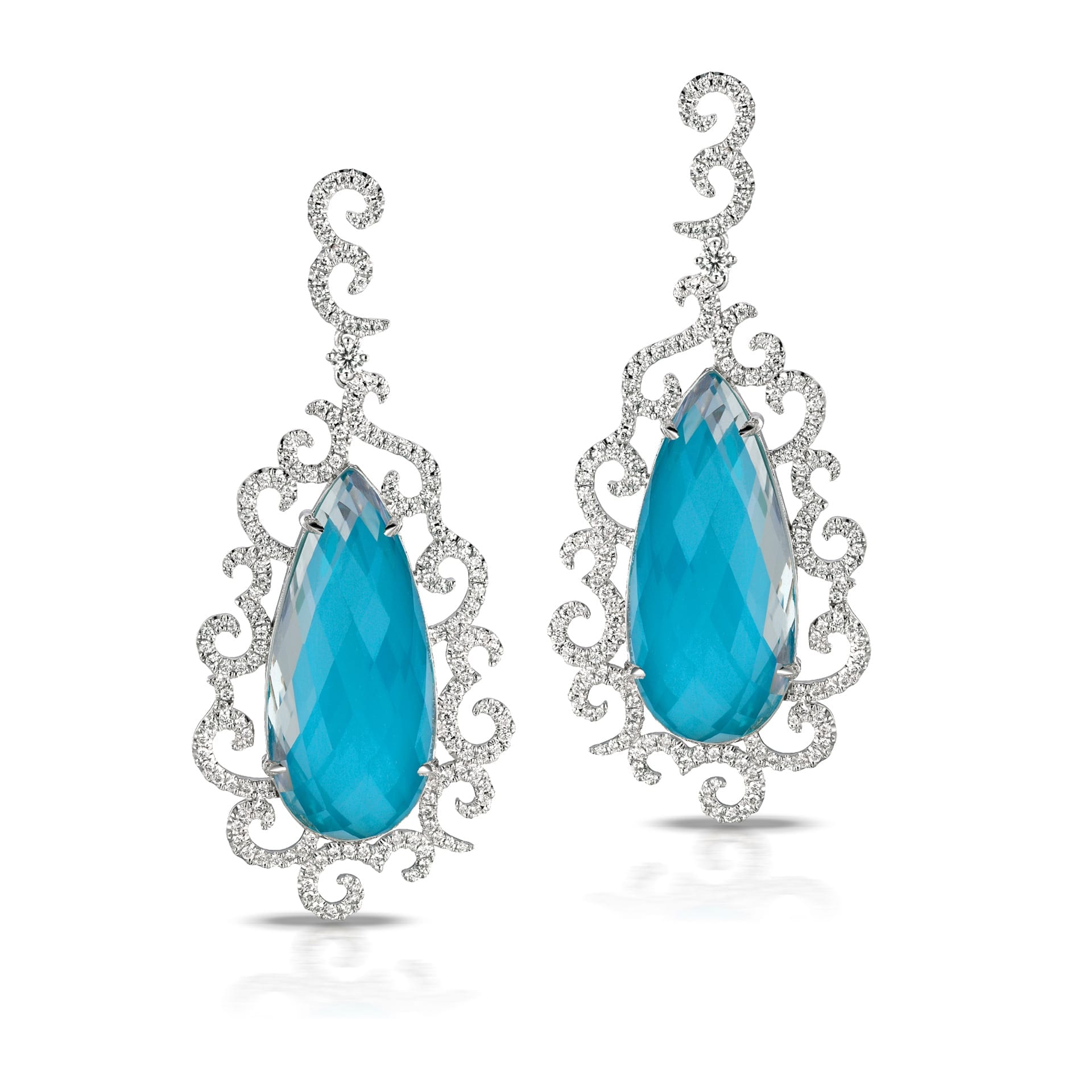 Ornate 18k White Gold Diamond Earring With White Topaz Over Turquoise