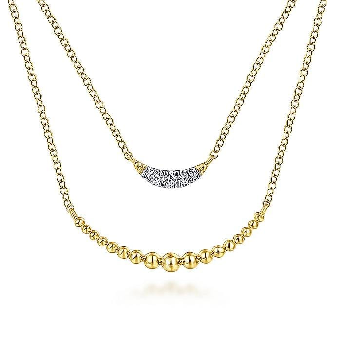 Pre-Layered Necklace With Crescent Shaped Diamond Pendant Above A Curving Beaded 14k Yellow Gold Bar