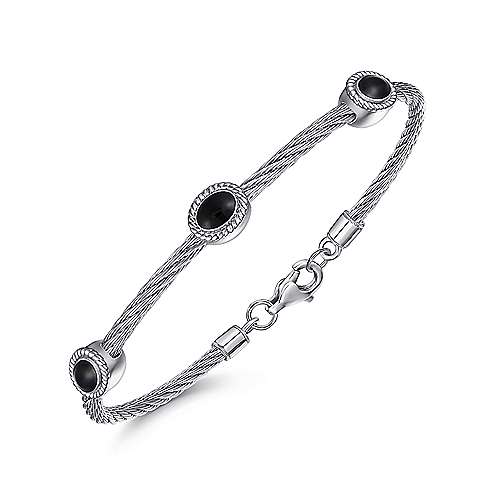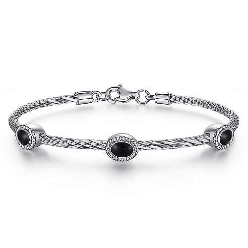 925 Sterling Silver-Stainless Steel Twisted Cable Bangle with 3 Oval Black Enamel Stations