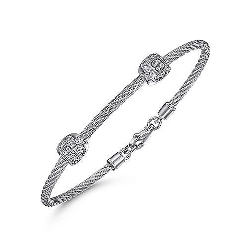926 Silver and Stainless Steel Twisted Cable Bangle with 2 Square Cluster Diamond Stations