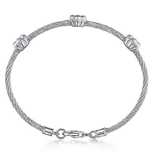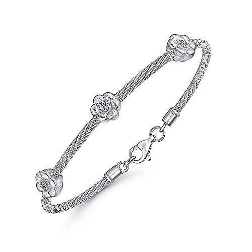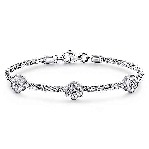 925 Sterling Silver-Stainless Steel Twisted Cable Bangle with 3 Flower Cluster Diamond Stations