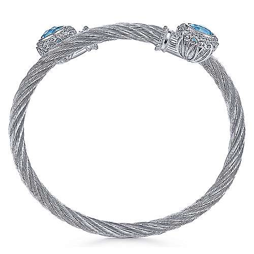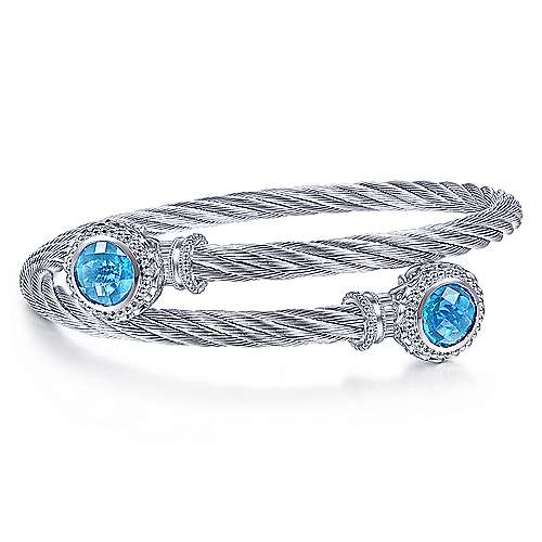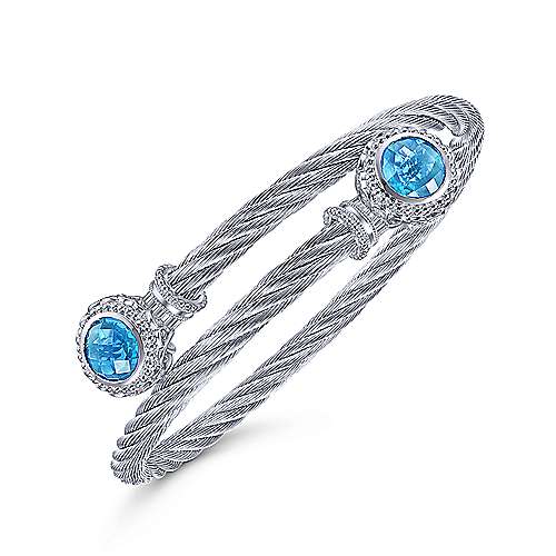 925 Sterling Silver and Twisted Cable Stainless Steel Blue Topaz Stone Bypass Bangle