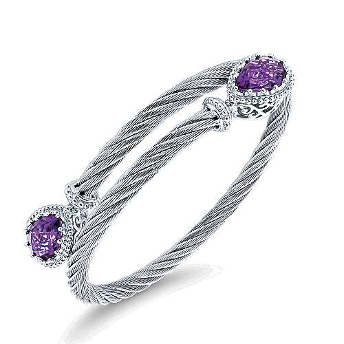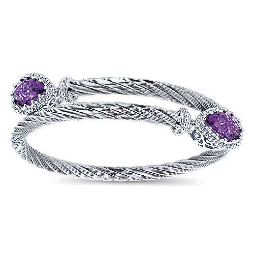 925 Sterling Silver and Stainless Steel Twisted Cable Amethyst Bypass Bangle