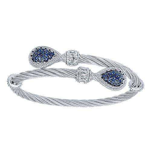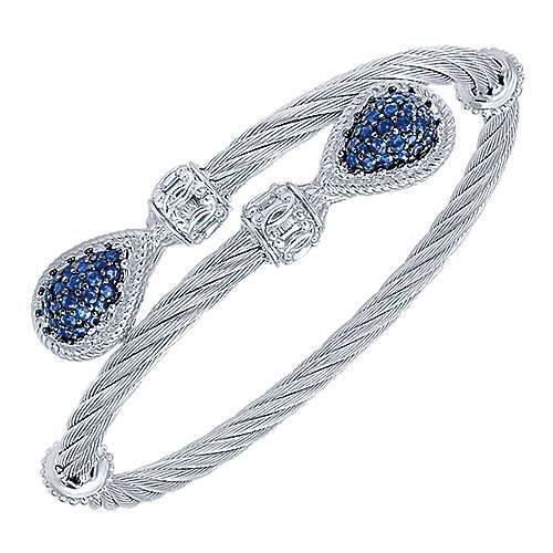 925 Sterling Silver and Stainless Steel Twisted Cable Sapphire Bypass Bangle