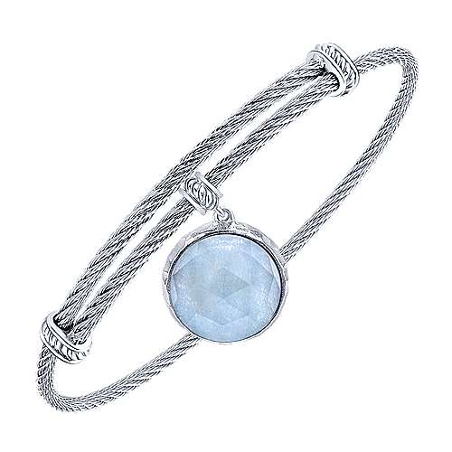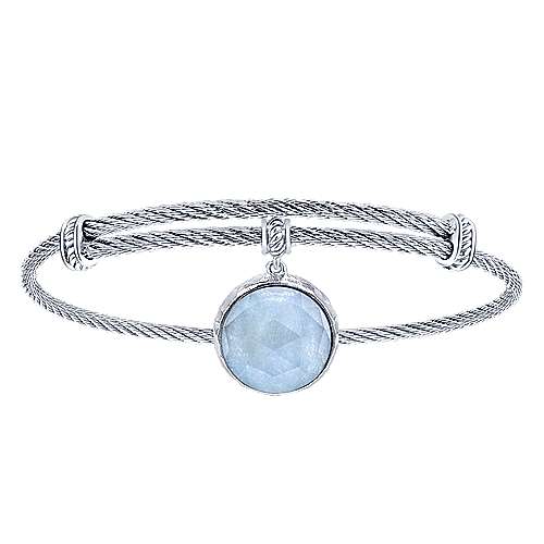 Adjustable Twisted Cable Stainless Steel Bangle with Round Sterling Silver Rock Crystal/Blue Jade Charm