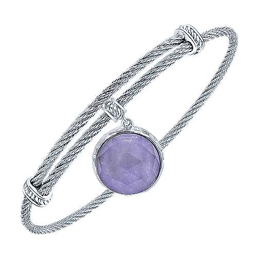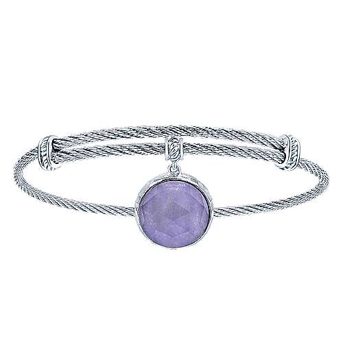 Adjustable Twisted Cable Stainless Steel Bangle with Round Sterling Silver Rock Crystal/Purple Jade Charm
