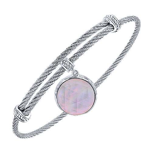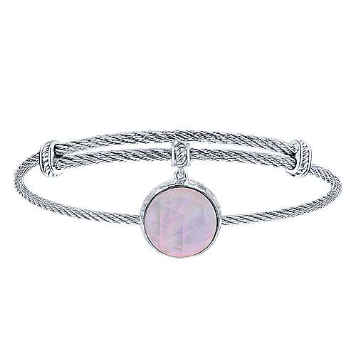 Adjustable Twisted Cable Stainless Steel Bangle with Round Sterling Silver Rock Crystal/Pink MOP Charm