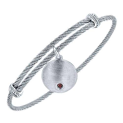 Adjustable Stainless Steel Bangle with Round Sterling Silver Garnet Stone Disc Charm