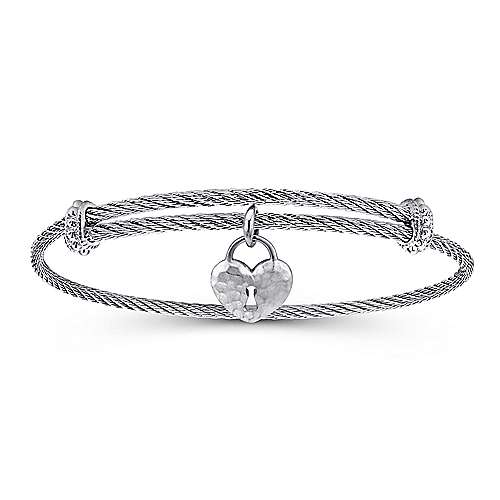 Adjustable Twisted Cable Stainless Steel Bangle with Sterling Silver Heart Lock Charm