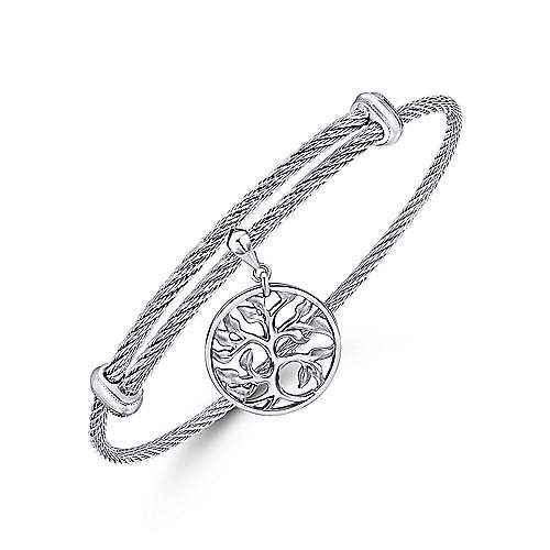 Adjustable Twisted Cable Stainless Steel Bangle with Sterling Silver Tree of Life Charm