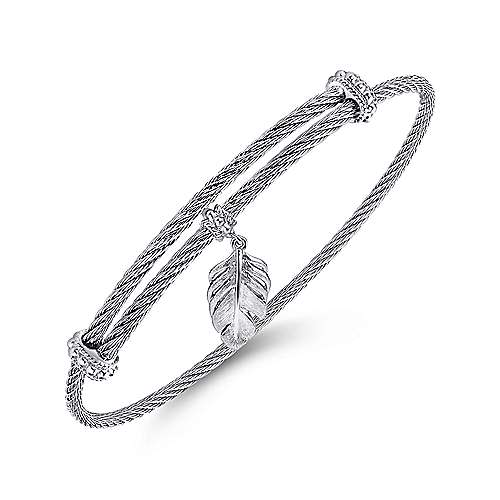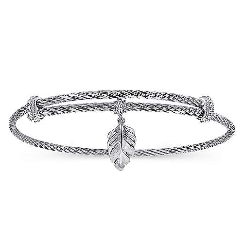 Adjustable Twisted Cable Stainless Steel Bangle with Sterling Silver Leaf Charm