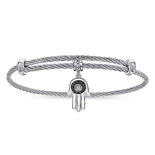 Adjustable Stainless Steel Bangle with Silver Black Spinel and White Sapphire Hamsa Charm
