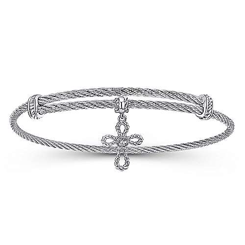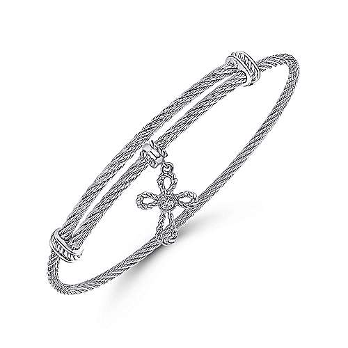 Adjustable Twisted Cable Stainless Steel Bangle with Sterling Silver and White Sapphire Cross Charm