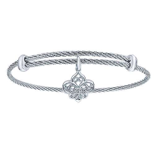 Adjustable Twisted Cable Stainless Steel Bangle with Sterling Silver Diamond Fleur de Lis Charm