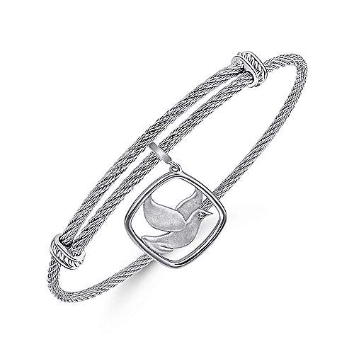 Adjustable Twisted Cable Stainless Steel Bangle with Sterling Silver Bird Charm