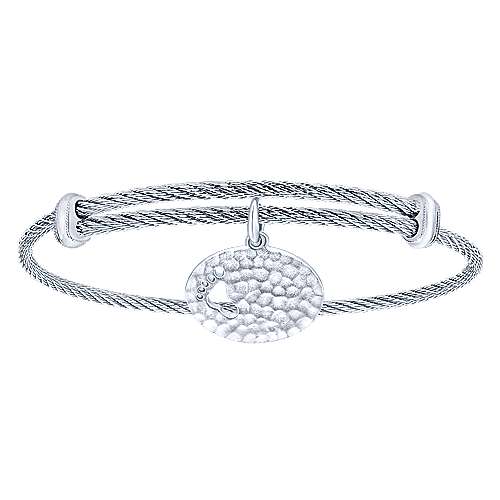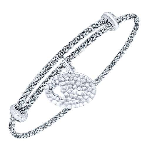 Adjustable Twisted Cable Stainless Steel Bangle with Sterling Silver Hammered Footprint Charm