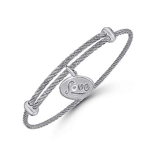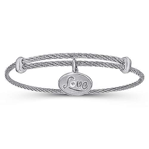 Adjustable Twisted Cable Stainless Steel Bangle with Sterling Silver Diamond Love Charm