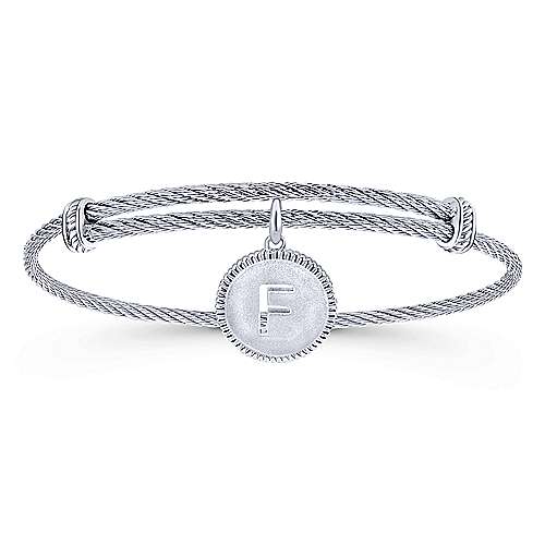 Adjustable Twisted Cable Stainless Steel Bangle with Sterling Silver F Initial Charm