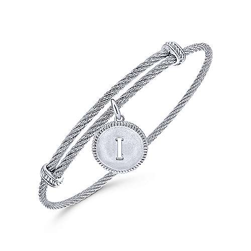 Adjustable Twisted Cable Stainless Steel Bangle with Sterling Silver I Initial Charm