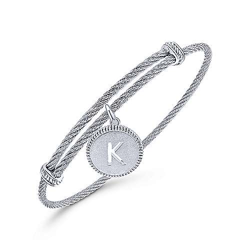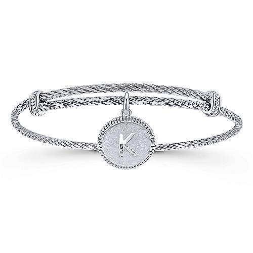 Adjustable Twisted Cable Stainless Steel Bangle with Sterling Silver K Initial Charm