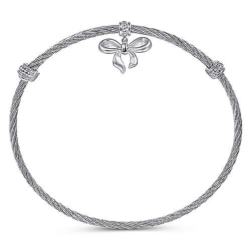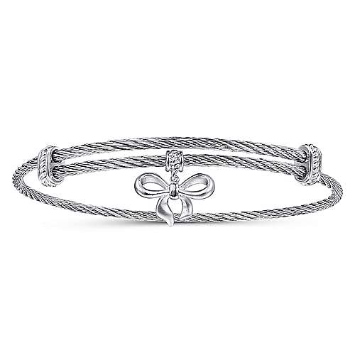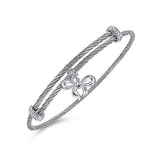 Adjustable Twisted Cable Stainless Steel Bangle with Sterling Silver Bow Charm