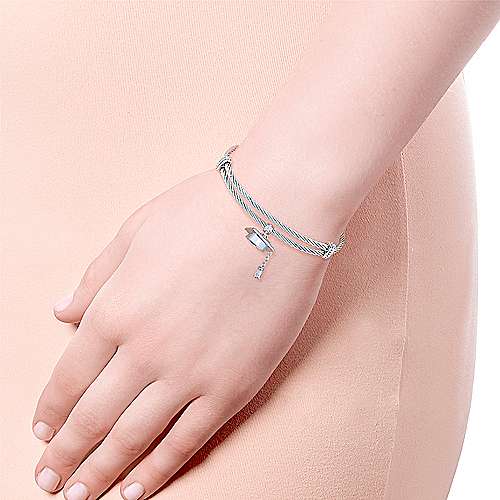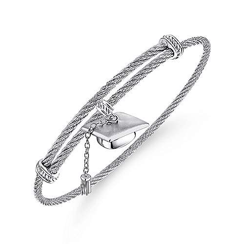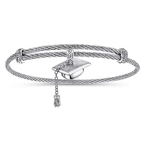 Adjustable Stainless Steel Twisted Cable Bangle with Silver Graduation Cap Charm