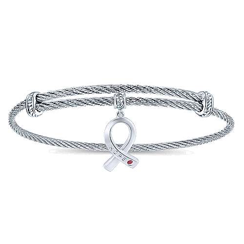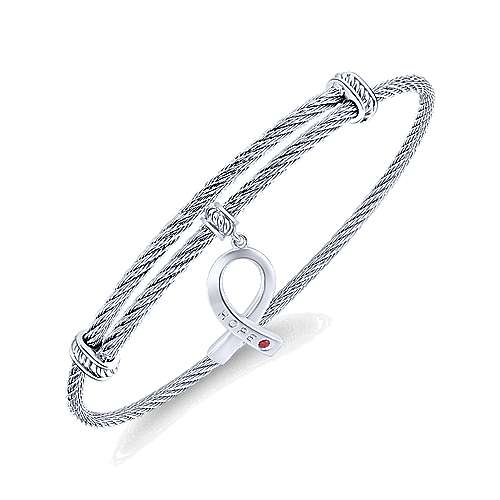 Adjustable Twisted Cable Stainless Steel Bangle with Sterling Silver Ruby Breast Cancer Charm