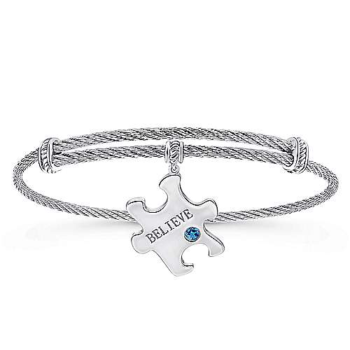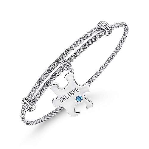 Adjustable Twisted Cable Stainless Steel Bangle with Sterling Silver Blue Topaz Puzzle Piece Charm