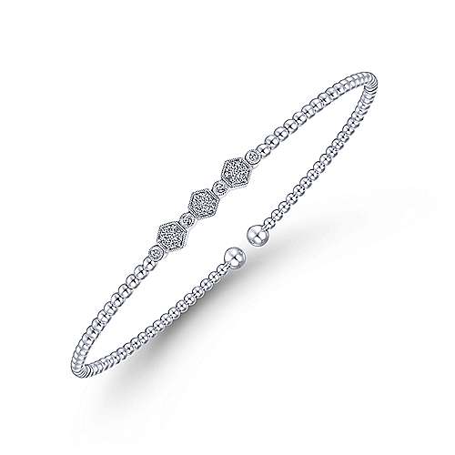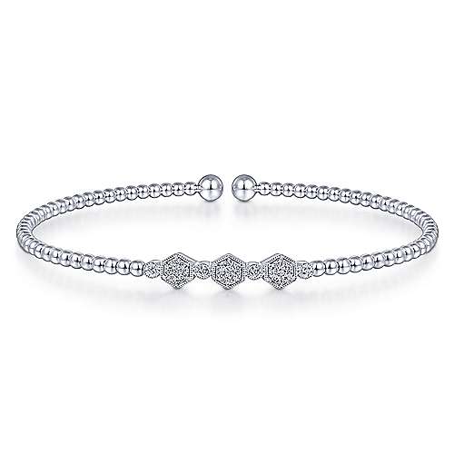 14K White Gold Bujukan Bead Cuff Bracelet with Cluster Diamond Hexagon Stations