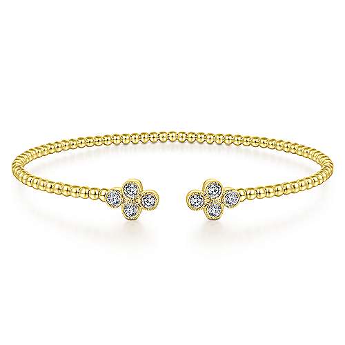 14K Yellow Gold Bujukan Bead Split Cuff Bracelet with Quatrefoil Diamond Endcaps