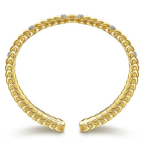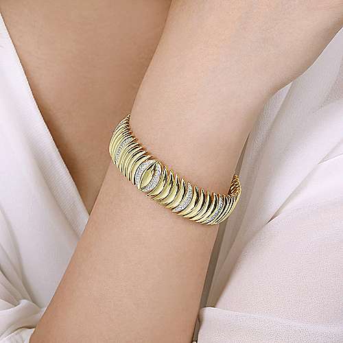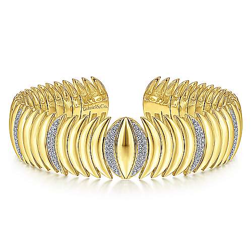 14K Yellow Gold Stacked Crescent Cuff Bracelet with Pavé Diamond Stations