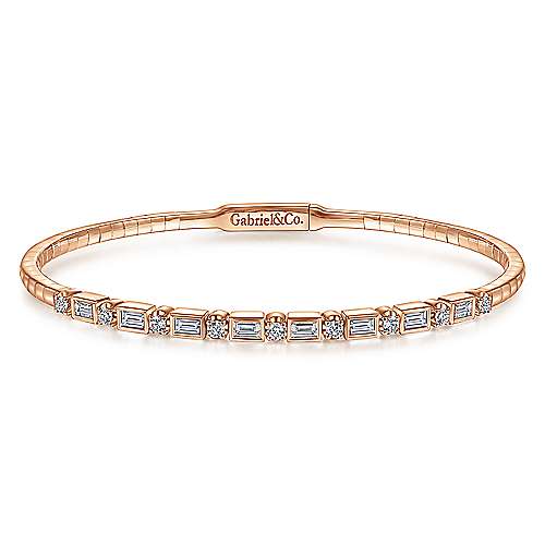 14K Rose Gold Alternating Baguette and Round Diamond Bangle
