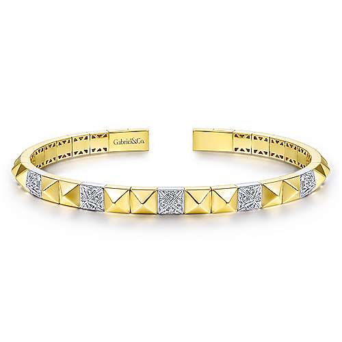 14K Yellow and White Gold Pyramid Bangle with Pavé Diamond Stations