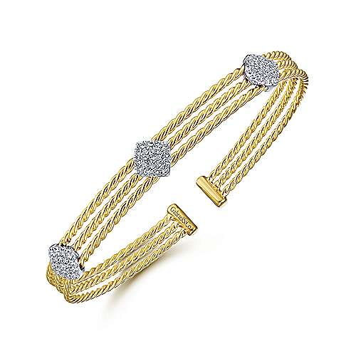 Twisted 14K Yellow Gold Bangle with Three White Gold Diamond Pavé Stations