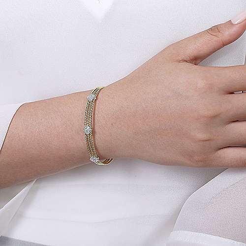 Twisted 14K Yellow Gold Bangle with Three White Gold Diamond Pavé Stations