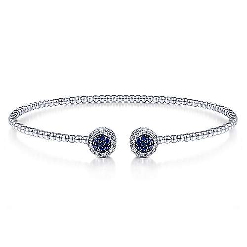14K White Gold Bujukan Bead Cuff Bracelet with Sapphire and Diamond Halo Caps