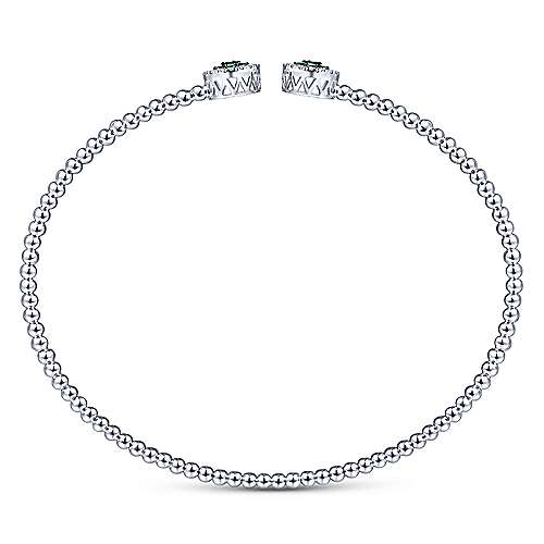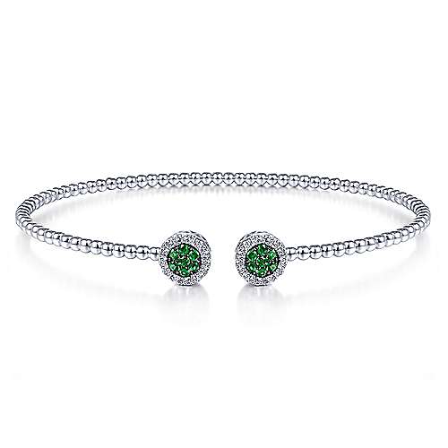 14K White Gold Bujukan Bead Cuff Bracelet with Emerald and Diamond Halo Caps