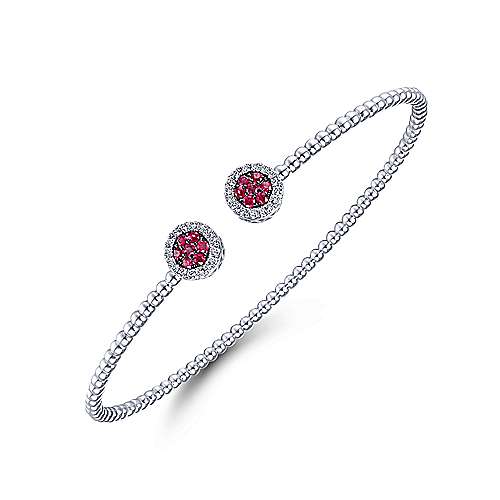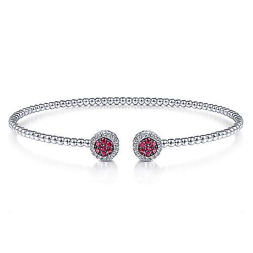 14K White Gold Bujukan Bead Cuff Bracelet with Ruby and Diamond Halo Caps