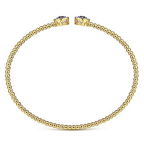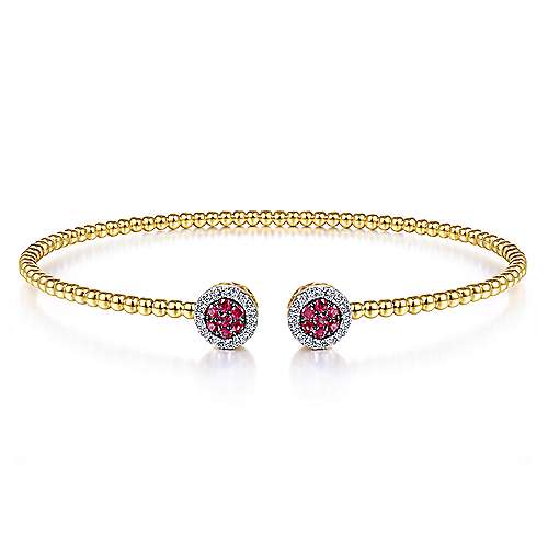 14K Yellow Gold Bujukan Bead Cuff Bracelet with Ruby and Diamond Halo Caps