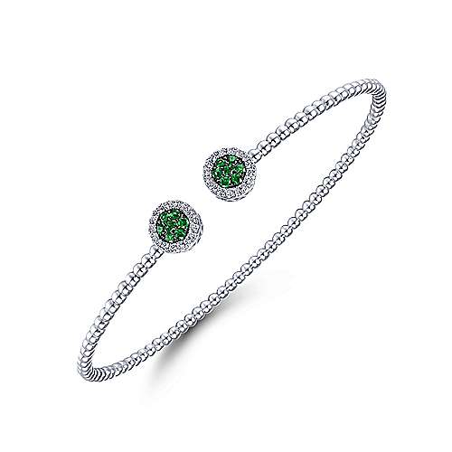 14K White Gold Bujukan Bead Cuff Bracelet with Emerald and Diamond Halo Caps