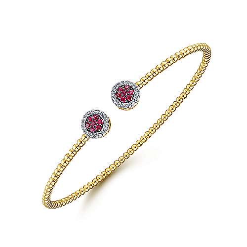 14K Yellow Gold Bujukan Bead Cuff Bracelet with Ruby and Diamond Halo Caps