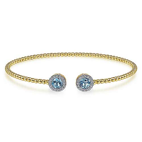 14K Yellow Gold Round Swiss Blue Topaz and Diamond Halo Bujukan Bangle