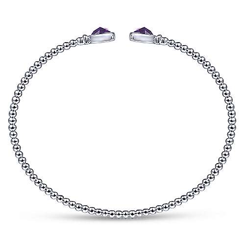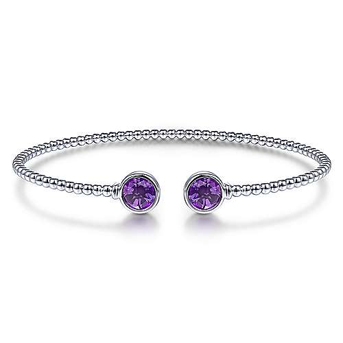 14K White Gold Bujukan Bead Cuff Bracelet with Bezel Set Round Amethyst