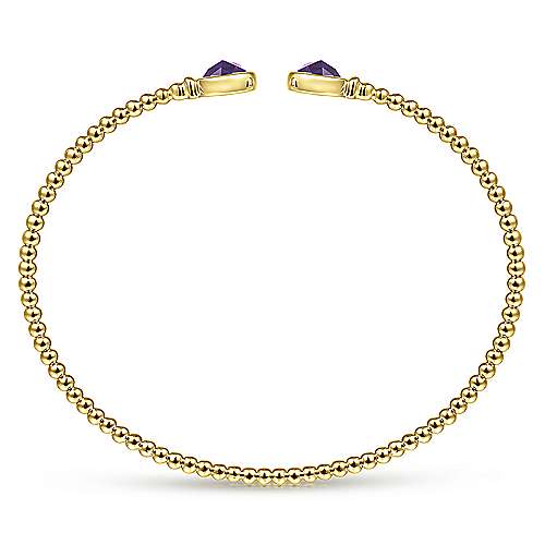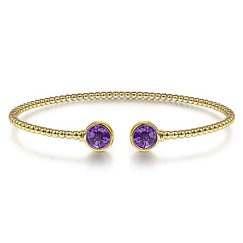 14K Yellow Gold Bujukan Bead Cuff Bracelet with Bezel Set Round Amethyst