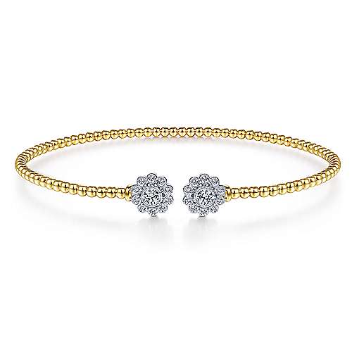 14K Yellow Gold Bujukan Split Cuff Bracelet with White Gold Diamond Flowers
