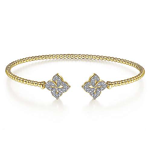 14K Yellow Gold Bujukan Split Cuff Bracelet with Diamond Flower Caps
