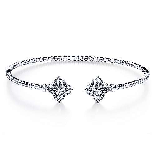 14K White Gold Bujukan Split Cuff Bracelet with Diamond Flower Caps