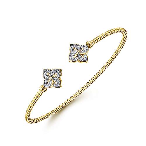 14K Yellow Gold Bujukan Split Cuff Bracelet with Diamond Flower Caps
